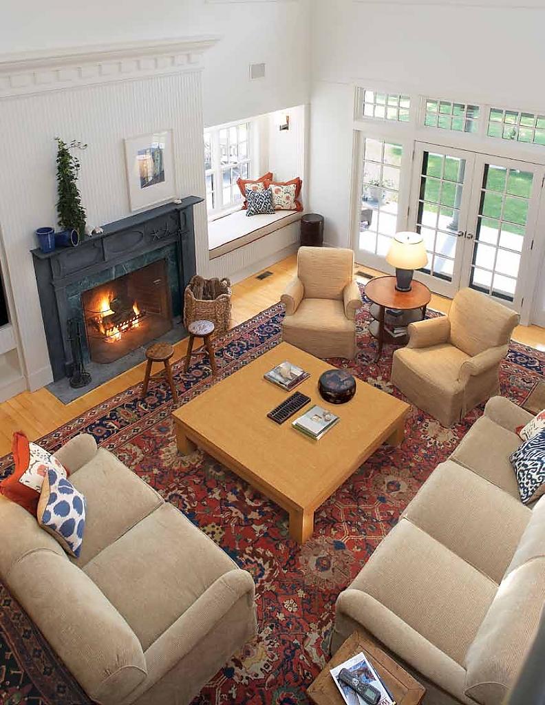 Die zweite Möglichkeit ist, dass alle Polstermöbel auf einem großen Teppich stehen, aber nicht mehr als die Hälfte unter den Möbeln. So können Sie sich auf den Sofabereich konzentrieren und ihn im Innenraum hervorheben.