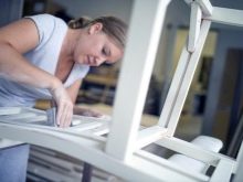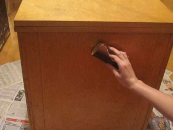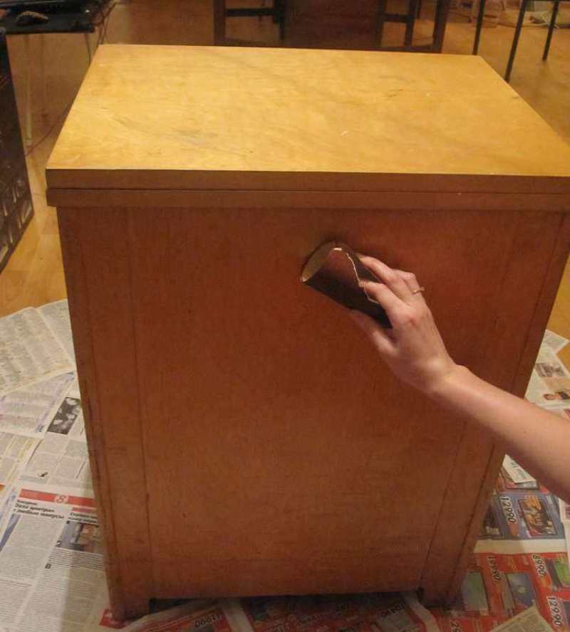 Zunächst ist es notwendig, Holzprodukte für die Malerei vorzubereiten. Entfernen Sie dazu alle Schubladen, Türen und Griffe von Möbeln. Sie werden einen Lappen, Sandpapier mit grobem und feinem Korn, einen Pinsel-fleyts (breit und flach) brauchen.