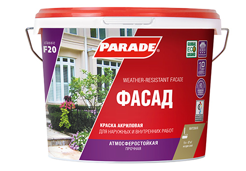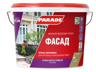 Farbe, veröffentlicht unter der Marke "Parade", entworfen für den Einsatz mit verschiedenen Materialien. Die Zusammensetzung eignet sich hervorragend für die Dekoration der Fassade aus Beton, Zement, Metall, Kitt oder Ziegel. Experten heben solche positiven Eigenschaften des Materials wie Dampfdurchlässigkeit, UV-Beständigkeit und Selbstreinigungsfunktion hervor. Das Produkt kann sicher in aggressiven und rauen Bedingungen verwendet werden.