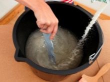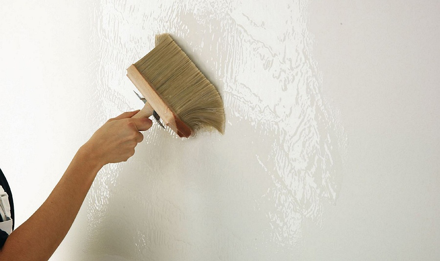 Die Schicht, die infolge der vorherigen Arbeitsstufe beschädigt wurde, ist mit Wasser getränkt. Kann Für eine bessere Wirkung, machen Sie eine Lösung mit Salz oder Tapetenkleister und wenden Sie es mit einer Rolle auf der Oberfläche an. Es ist notwendig zu warten, bis die Lösung absorbiert und das Erweichen des Betons beginnt. Es wird ungefähr fünf Stunden dauern..