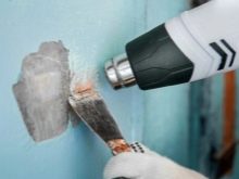 - Um diese Aufgaben zu erfüllen, verwenden sie normalerweise unter industriellen Bedingungen einen Gebäudetrockner, der eine ziemlich hohe Temperatur zum Ablösen von praktisch allen Arten von Farben bietet;