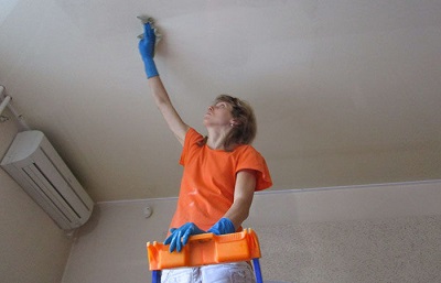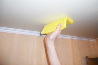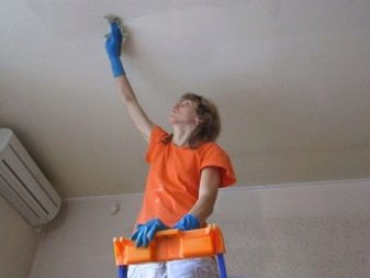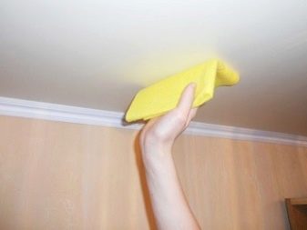 Eine andere Sache, wenn Sie die abgehängte Decke reinigen müssen. Es ist unwahrscheinlich, dass jemand es malen würde, aber Farbe könnte versehentlich die Oberfläche treffen. PVC-Folie, aus der normalerweise solche Decken hergestellt werden, schließt grundsätzlich die Verwendung von Schleifmitteln aus, die die Oberfläche zerkratzen können. Die Verwendung von chemischen Lösungsmitteln ist ebenfalls sehr unerwünscht - die Gefahr, die Folie selbst versehentlich zu lösen, ist groß.