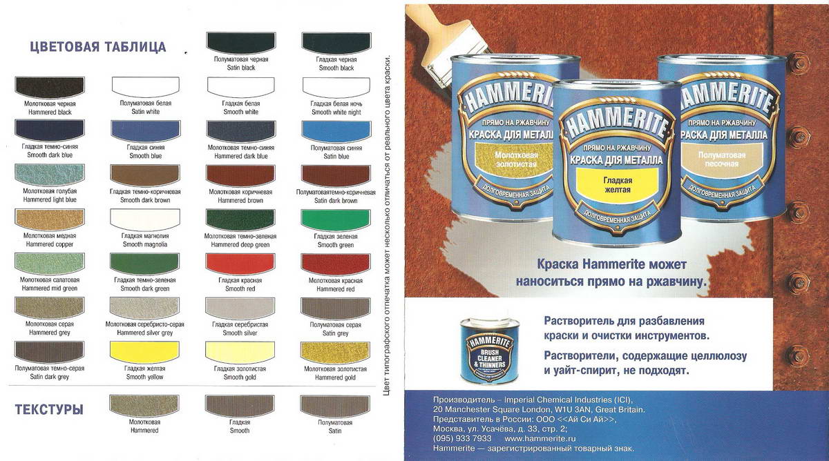 - Hammerit - Hammerfarbe von höchster Qualität, extrem effektiv, ist nicht billig. Es hat eine breite Palette von Farben.