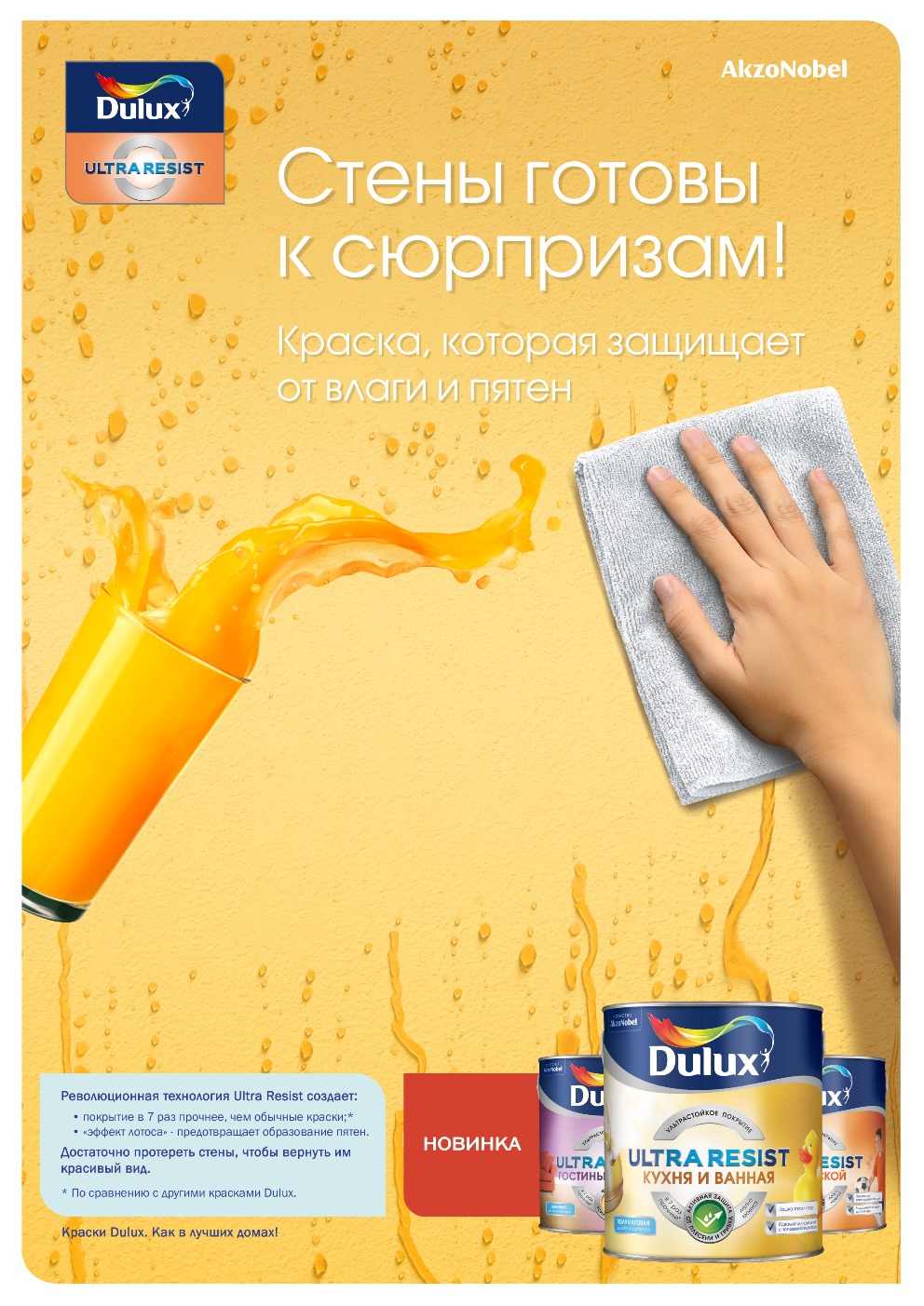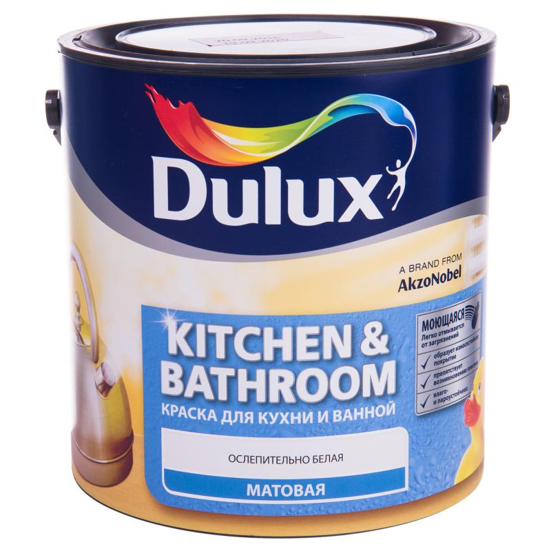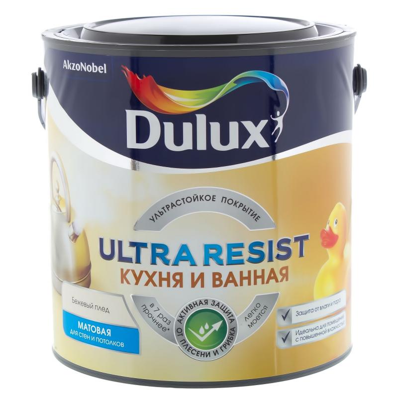 Eine weitere anständige Option - Ultra resistenter Latex Dulux Ultra Resist Lack für Bad und Küche. Es zeichnet sich durch die Unempfindlichkeit gegenüber mechanischen Beschädigungen und nützliche Eigenschaften aus, die den Raum vor Schimmel und Schimmel schützen. Die Beschichtung ist wasserabweisend und schmutzabweisend, sie ist beständig gegen heißen Wasserdampf, kann matt und seidenmatt sein. Die Farbe ist auch optimal für Kinderzimmer, öffentliche Plätze mit erhöhter Betriebsbelastung.