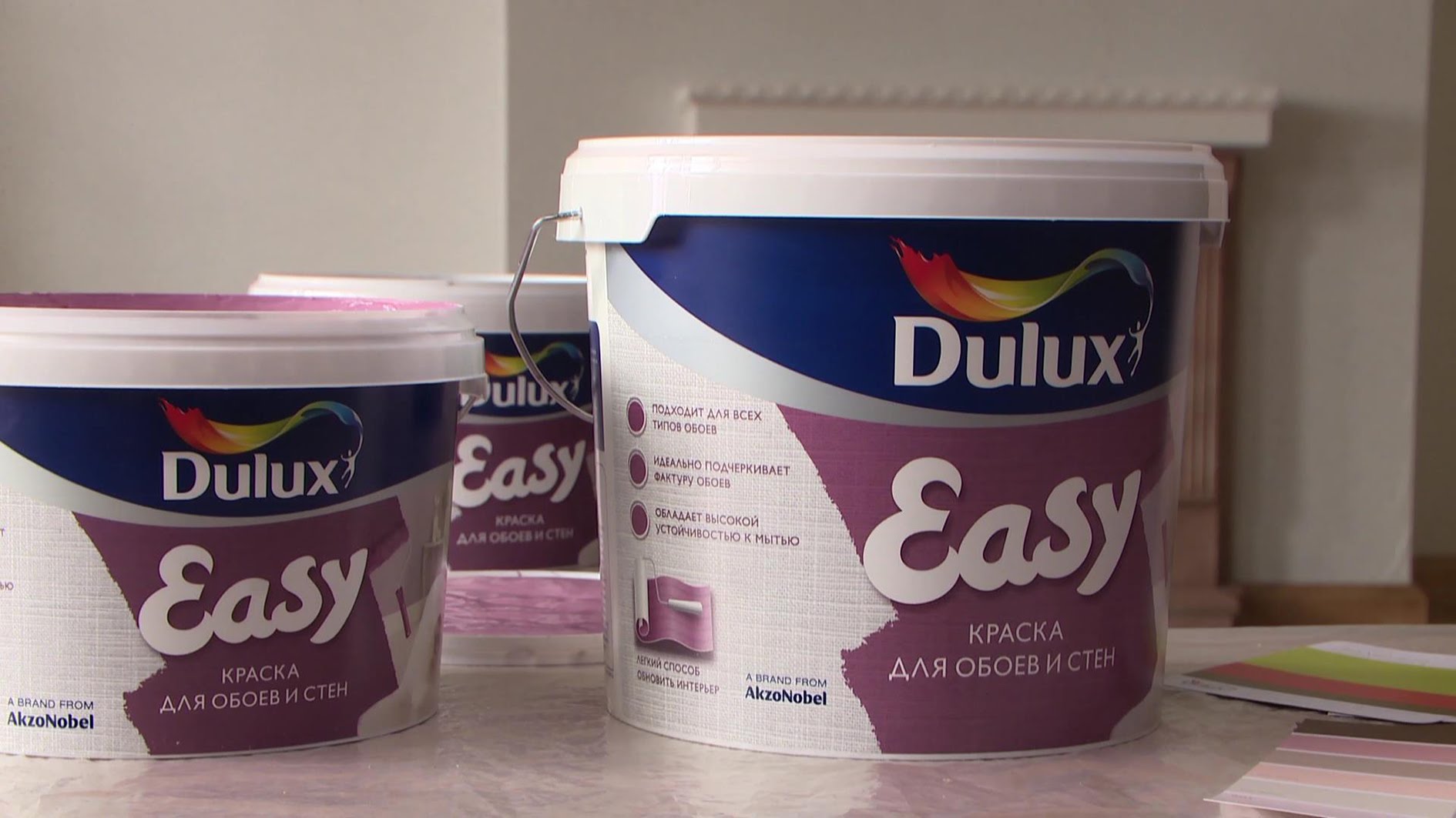 - Tinten sind auch sehr gefragt Dulux einfachDas ist perfekt zum Auftragen auf Putz und Tapeten. Hierbei handelt es sich um eine matte Wasserdispersionsfarbe, die ideal auf Papier und Vinyl aufliegt, die Textur der Tapeten betont und perfekt mit Wasser und nicht aggressiven Waschmitteln gewaschen wird.
