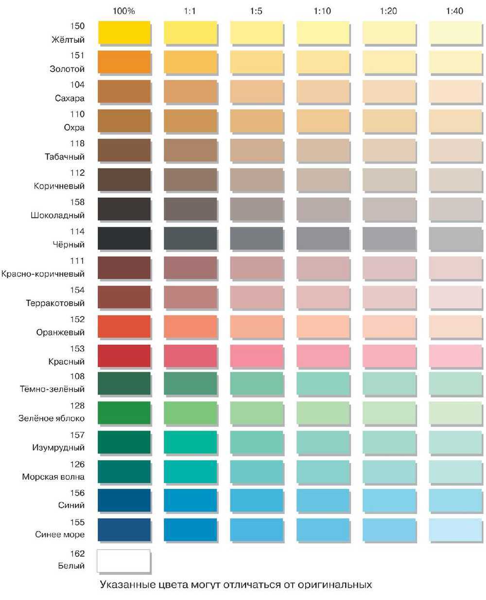 Die Farbpalette der Farbmischungen fällt auf, in der Regel werden Farben für Farben zur Verfügung gestellt, mit denen Sie einen Farbton beliebiger Intensität erzeugen können.
