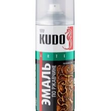 - Kudo - Dies ist ein spezielles Email, das als Aerosol-Mischung verkauft wird. Geeignet für die Verarbeitung von nur Metallstrukturen aus schwarzer Legierung. Der Hersteller positioniert es als hochwertige Emaillierung, die den vorhandenen Rost zerstört und sein neues Aussehen verhindert. Bewertungen dieses Emails bestätigen nur diese Aussage. Käufer beachten, dass trotz dieser hohen Qualität die Kosten für dieses Produkt verfügbar sind.