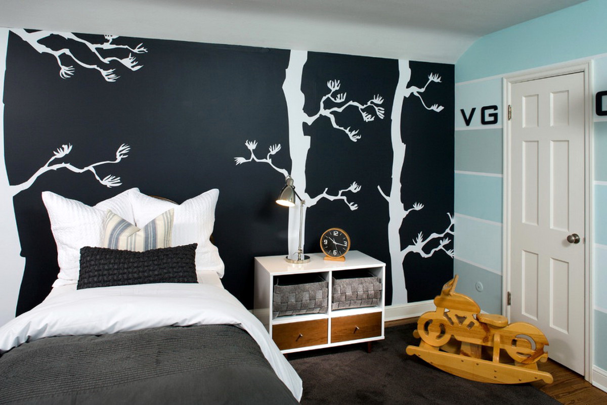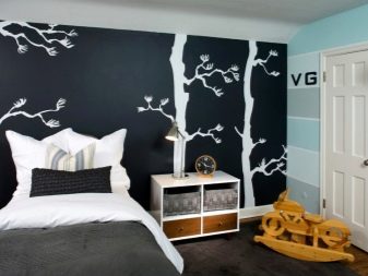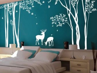 Ungewöhnliche Dekoration mit Bildern kann kleinere Mängel im rauhen Ende der Wände für das Malen verbergen. Wenn Sie leicht unebene Wände haben, sollten Sie sie nicht leicht und glatt machen - das wird alle Mängel offen legen. Wenn Sie eine interessante Farbkombination auswählen und mit einer Schablone ein Bild malen, werden die Fehler fast unmerklich.