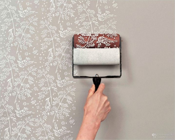 Jetzt beliebte Schablonenwalzen. Sie haben auf ihrer Oberfläche prominente konvexe Muster, die beim Auftragen gedruckt werden. Solche Schablonenrollen sind geeignet, wenn Sie die ganze Wand mit kleinen Verzierungen bedecken wollen.