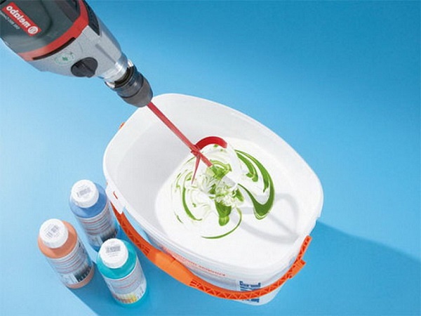 - Durch die Oberflächenmischung der Farbe wird keine einheitliche Farbe erhalten. Es wird empfohlen, einen Mischer oder eine Gipsdüse für einen Bohrer zu verwenden, der für eine gründliche Durchmischung sorgt. In diesem Fall muss der Bohrer auf ein Minimum eingestellt werden, damit keine Farbe spritzt.