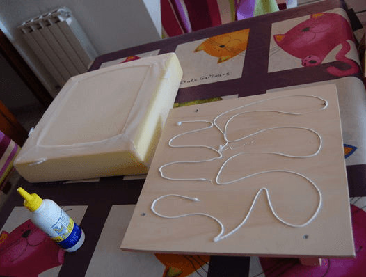 - Sie müssen den Schaum mit einem speziellen Kleber kleben, oft als "Schaumgummi" bezeichnet, enthält es Stoffe wie Polyurethan und Neopren. Die Konsistenz dieses Klebers ist ziemlich viskos, so dass er nicht die gesamte Schaumgummischicht durchtränkt, was sehr wichtig ist, da die imprägnierte Schicht nach dem Trocknen sehr hart wird und leicht ihre Form verliert.