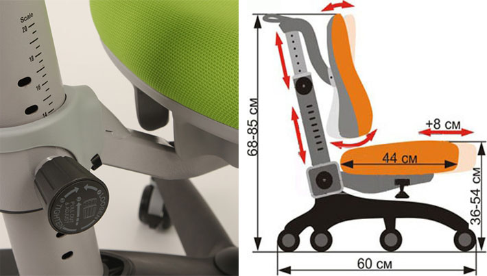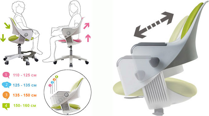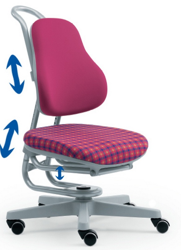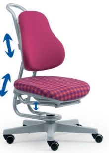 Das Design des Stuhls für den Schüler ermöglicht eine Anpassung der Sitzhöhe an den wachsenden Körper.Neben der Tatsache, dass das Gerätemodell das Anheben und Absenken des Sitzes beinhaltet, kann der Stuhl einen einstellbaren Neigungswinkel der Rückenlehne aufweisen. Diese Funktion ist in erster Linie für Kinder erforderlich, die bereits eine Korrektur der Körperhaltung benötigen.