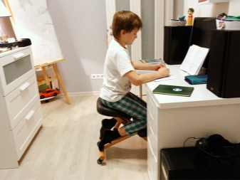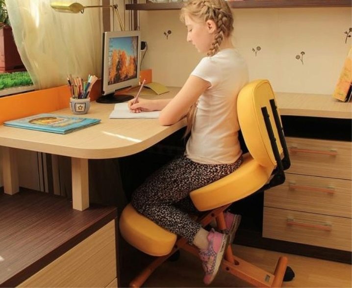 Modelle, die auf den Knien basieren, sind so konstruiert, dass sie die Belastung des Rückens reduzieren, indem sie einen Teil des Drucks auf das Gesäß und das Unterbein übertragen. Äußerlich ist das Design wie ein Stuhl mit einer Neigung. Das Kind, das auf diesem Stuhl sitzt, ruht mit seinen Knien auf dem Ständer, während die Oberseite des Rückens den Rücken des Schülers fixiert.
