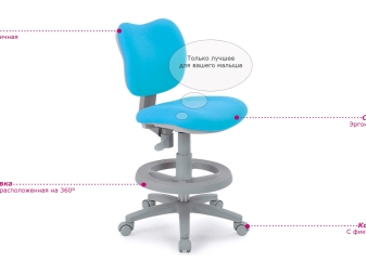 Eine Besonderheit des Designs des Stuhls für den Schüler ist eine eigenartige Form des Rückens, die innere Rollen hat, um den Rücken des Kindes zu stützen. In den meisten Fällen hat es eine anatomische Form, und der Stuhl selbst ist mit einer kreuzförmigen Auflage auf Rädern mit einer Fußstütze ausgestattet. Die Anzahl der Zweige kann unterschiedlich sein (von 4 bis 6 Stück). In der Regel gilt, je mehr von ihnen, desto zuverlässiger und stärker ist der Stuhl.