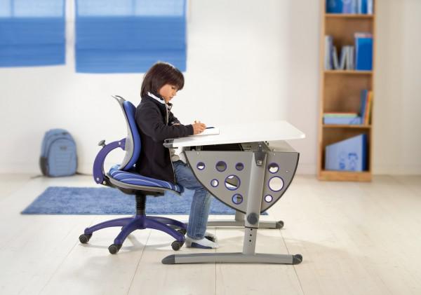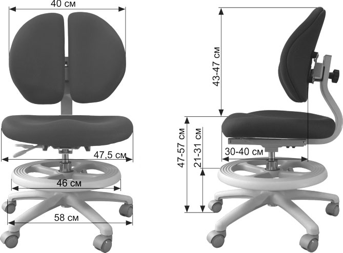 - Kinderstuhl - ergonomische Stühle für Schulkinder mit einer Reihe von Einstellungen für die Rückenlehne und den Sitz. Sie haben eine automatische Verriegelung der Räder, wenn ein Kind auf einem Stuhl sitzt, der mehr als 30 kg wiegt.Eine Besonderheit des Designs ist die Position der Fußstütze um 360 Grad, während der Abstand vom Boden zu den Stufen 25 cm beträgt.