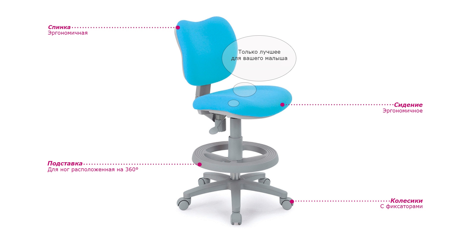Die meisten Kindersitze für den Schüler bestehen aus einem Rahmen, Blöcken der Rückenlehne und des Sitzes, Stützen mit Beinen und drehbaren Rollen.