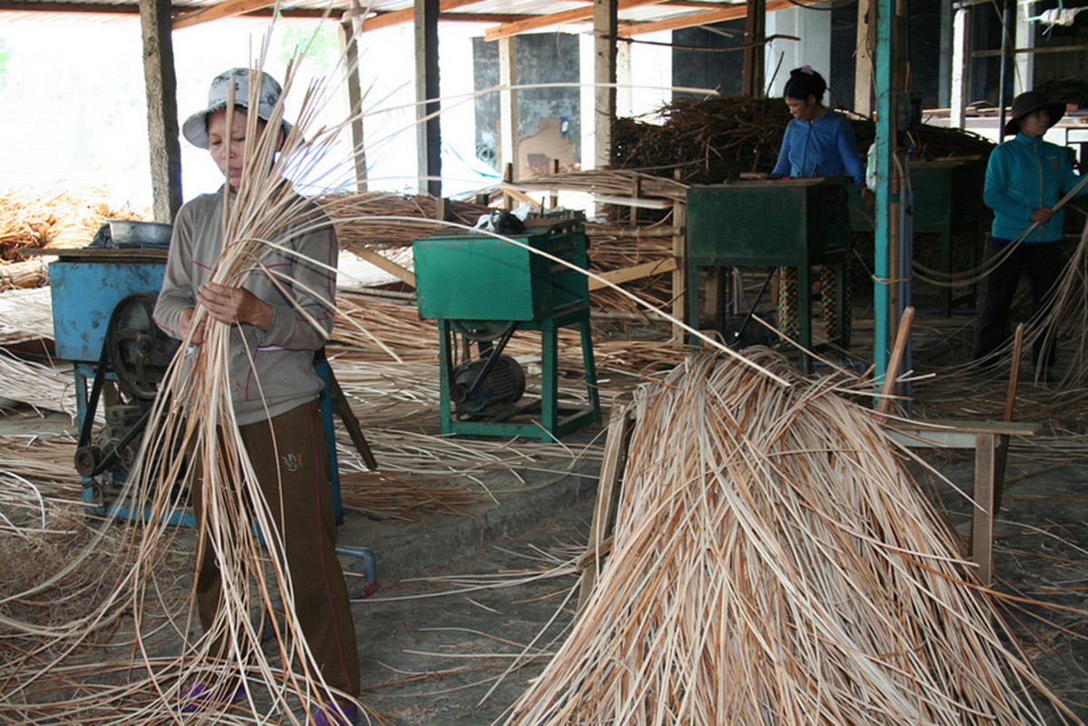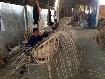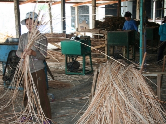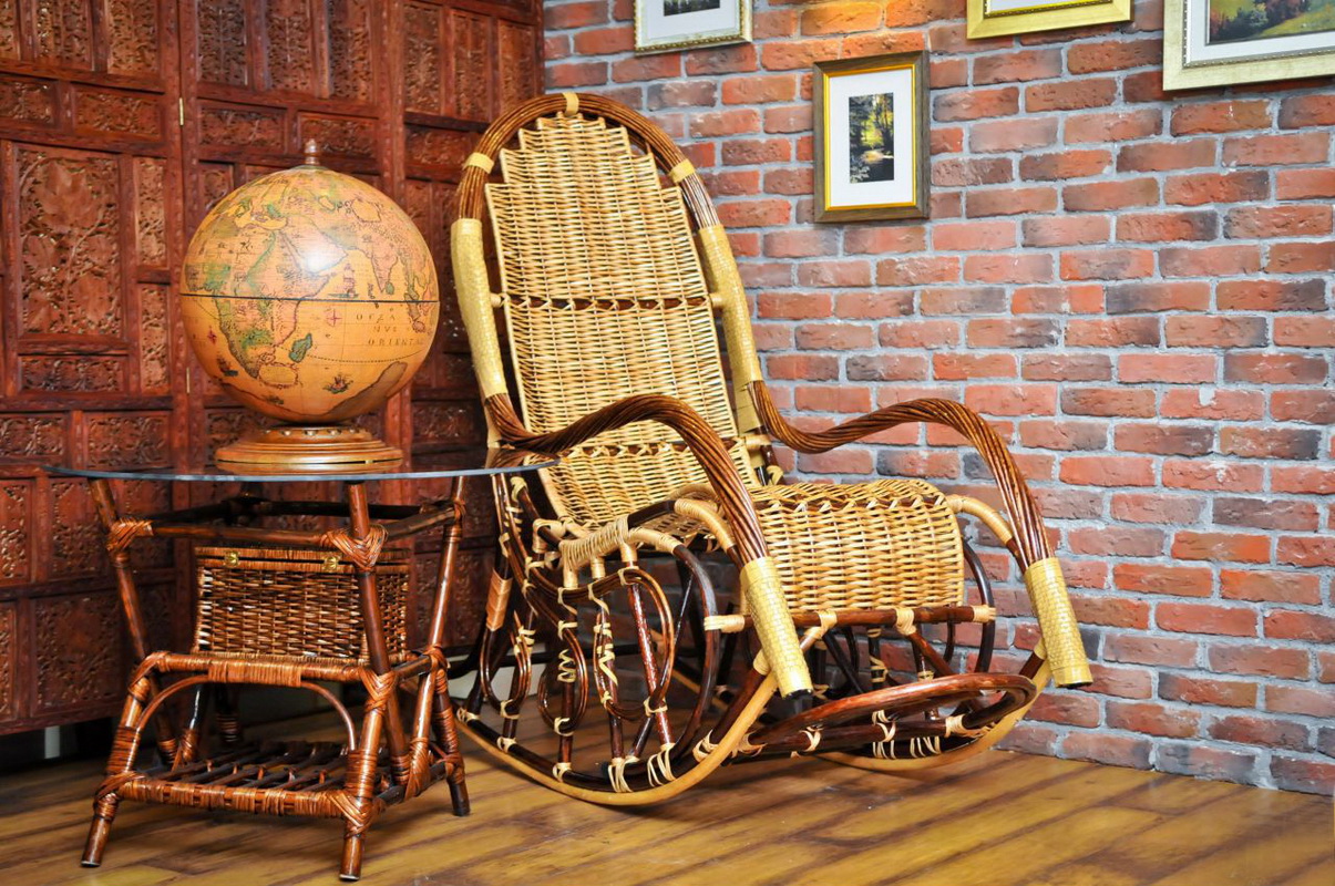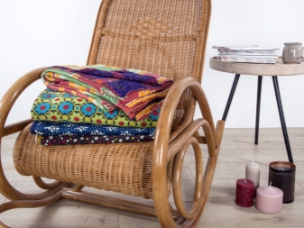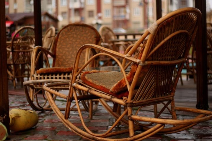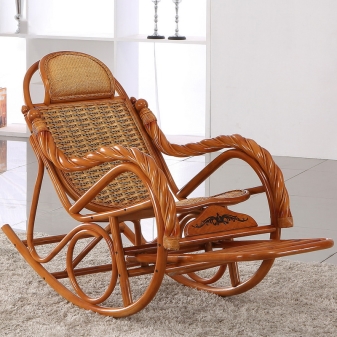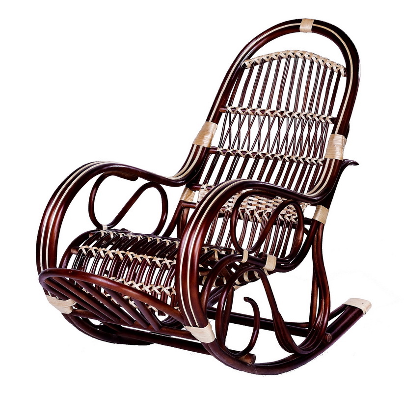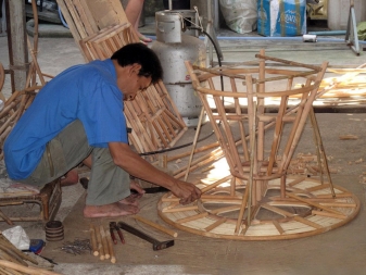 Einen Schaukelstuhl aus Rattan herzustellen, ist ein zeitraubender Prozess, denn seine Stäbe müssen sorgfältig vorbehandelt werden. Die Stängel sind geschält, in der Dicke geordnet, gedämpft und begradigt. Dünne Stiele werden verwendet, um die Ecken zu dekorieren oder ein Muster zu weben, und dicke Stäbe werden benötigt, um eine Karkasse herzustellen. Um den Stielen eine besondere Form zu geben, müssen sie auf einer speziellen Maschine befestigt werden. In dieser Position sollten sie ungefähr einen Tag lang liegen, danach werden sie entfernt und Rillen und Kerben werden auf ihnen gemacht. Alle Teile sind auch durch Rattan durch die Löcher verbunden. Auf der Oberseite des Produkts wird mit Lack oder Wachs behandelt, so dass es so lange wie möglich dauert.