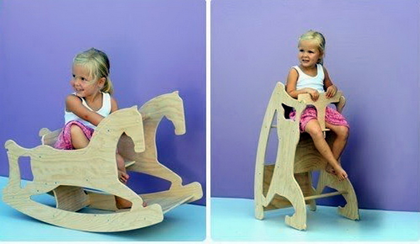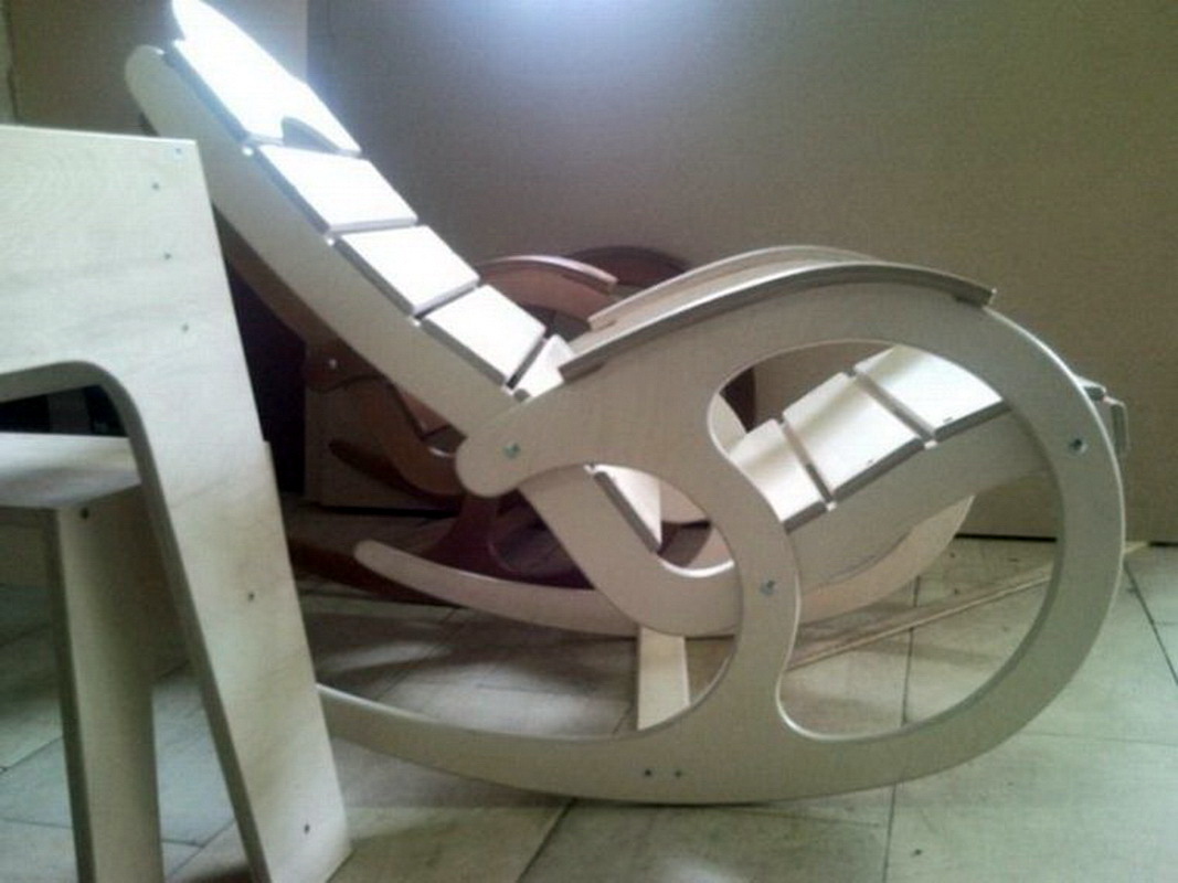 Erinnerungen an einen selbstgebauten Schaukelstuhl werden die Seele von erwachsenen Kindern für eine lange Zeit erwärmen. Einen Schaukelstuhl für ein Kind zu machen, hat keine radikalen Unterschiede zu einem normalen Stuhl. Das einzige, was berücksichtigt werden sollte, ist die Größe und Proportionen sowie das Vorhandensein von Stiften. Schaukelstuhl für Kinder macht oft in Form eines Pferdes, aber das ist nicht mehr Möbel, sondern ein Spielzeug. Betrachten Sie die einfachste Option.Notwendige Ausrüstung: Kreis- und Gehrungssägen, Bulgarisch, Fräser, Stichsäge und eine Reihe von Sechsecken. Benötigte Materialien: 18 mm Sperrholz, Pappe, 2 Gewindestangen 50-60 cm lang, 4 Muttern für Haarnadeln und Farbe. Wir beginnen mit Seitenwänden zu machen. Schneiden Sie sie auf die Sperrholzzeichnung. Schneiden Sie die Rillen aus. Die Dicke des Sperrholzes bestimmt die Dicke der Nut. Löcher bohren.