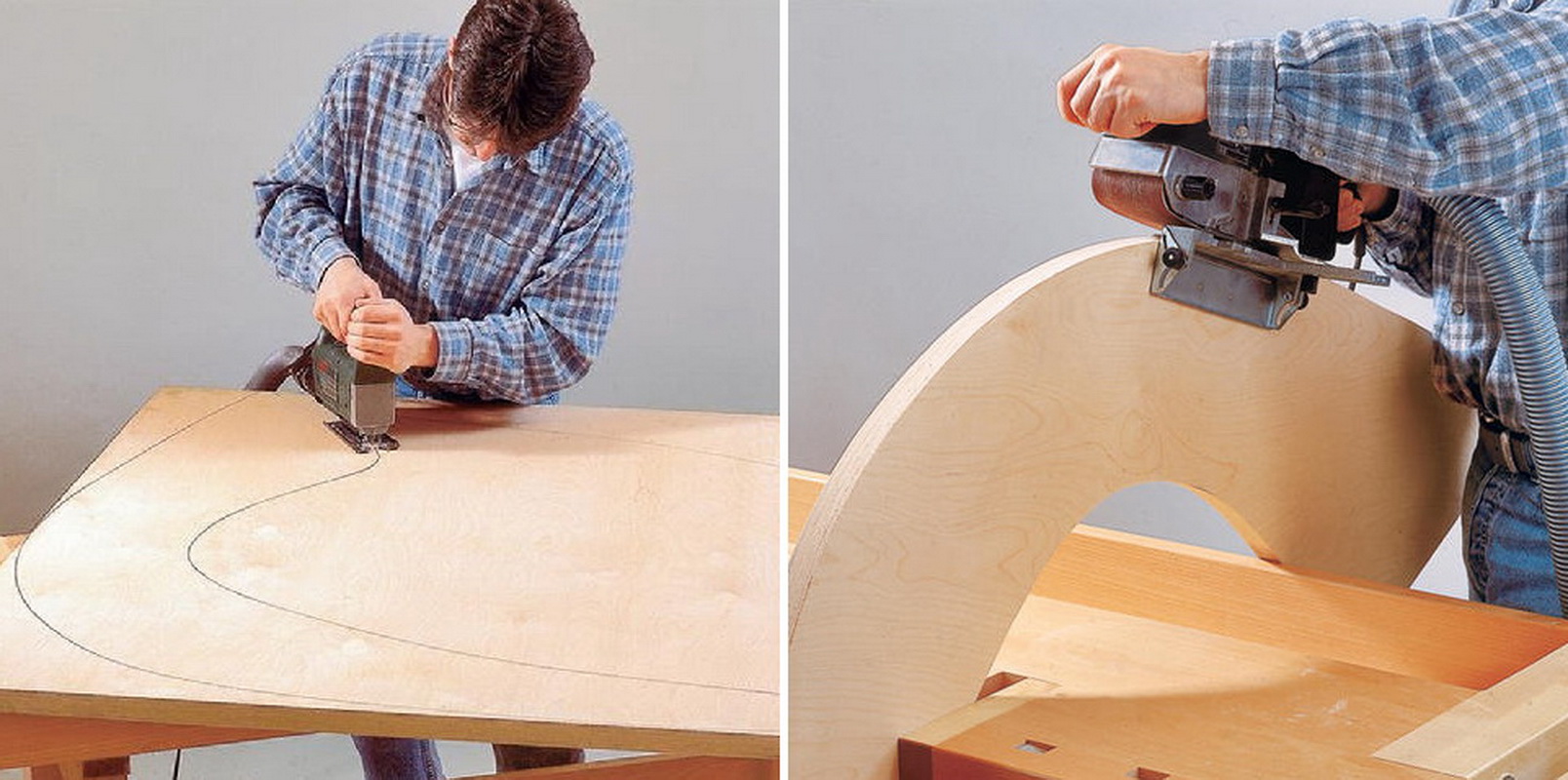 - Schneiden Sie die Seitenelemente aus Sperrholz mit einer Stichsäge oder einer Metallsäge aus. Wir bekommen eine halbkreisförmige Basis mit Rillen unter dem Flanell.