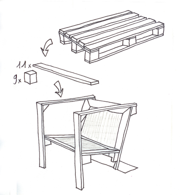 Für die Herstellung dieses Produkts werden keine Zeichnungen und Vorbereitung von zusätzlichen Elementen benötigt. Der selbstgebaute Stuhl aus Paletten kann in nur ein paar Stunden hergestellt werden: