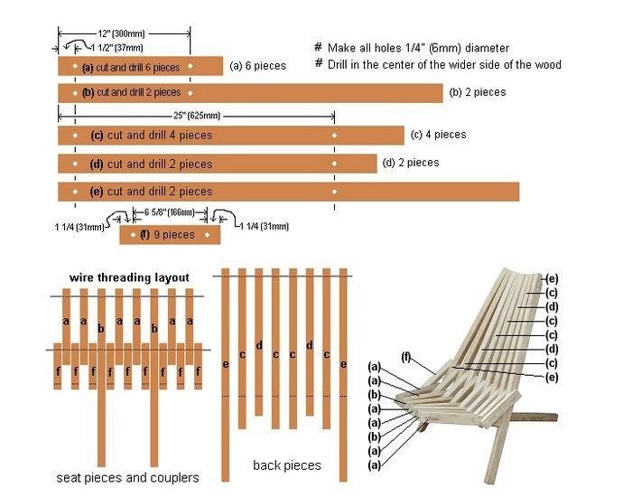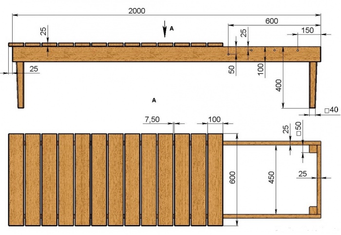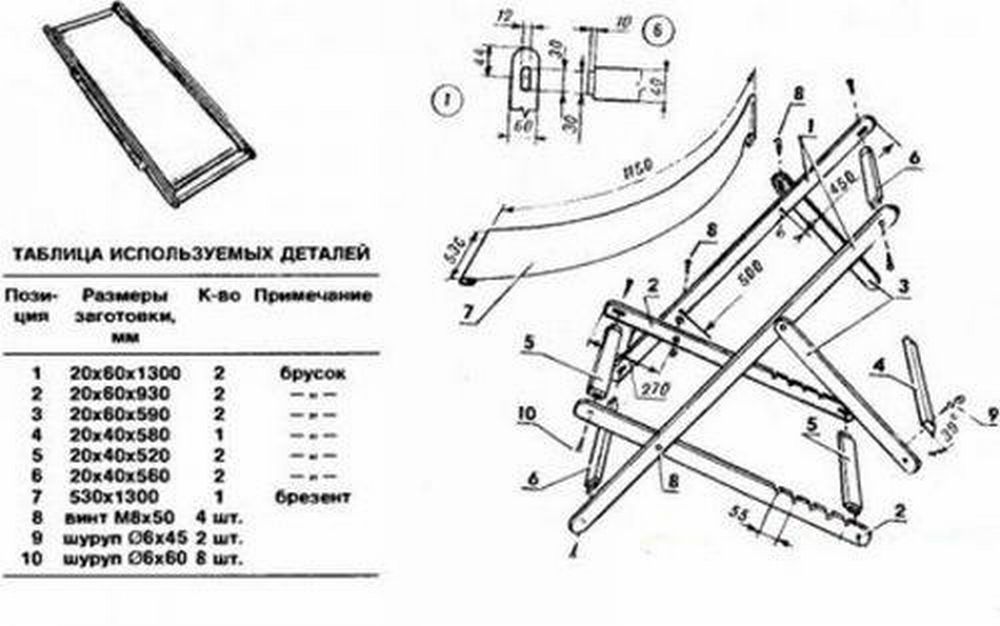 Solch eine Chaiselounge ist stark genug, zuverlässig und ihr Rücken kann eingestellt werden. Für ein solches Modell sollten Holzplatten von Nadelbäumen genommen werden, da sie resistent gegen klimatische Veränderungen sind. Hier ist ein Diagramm mit den angegebenen Dimensionen: