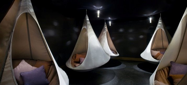 Zu den Besonderheiten solcher Modelle, die an der Decke angebracht sind, gehört die Tatsache, dass ihr Innenraum vor neugierigen Blicken verborgen ist.Dieses Urlaubsziel wird eine ausgezeichnete Wahl für diejenigen sein, die sich zurückziehen oder die Einsamkeit lieben wollen.