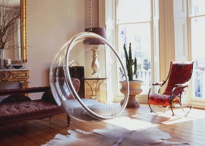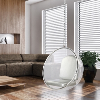 - Acryl hängenden "Ball" passt perfekt in ein minimalistisches High-Tech. Schaukeln kann einen hellen Akzent setzen, wenn Sie ein Modell einer Kontrastfarbe wählen. Vor dem Hintergrund eines einfarbigen Innenraums wird ein solches Detail sehr interessant aussehen.