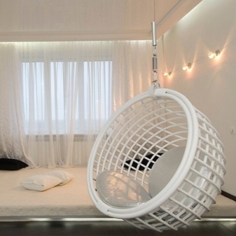 - Das Schlafzimmer. Der aufgehängte Eierstuhl wird in der Regel im Schlafzimmer, kombiniert mit einem Balkon oder in einem sehr geräumigen Raum verwendet, in dem sich nicht nur der Schlafbereich, sondern auch der Sitzbereich befindet. Wenn Sie einen Schaukelstuhl an einem Fenster oder in einer Ecke aufgestellt haben, wird sich daraus ein schöner Ort für Entspannung ergeben.