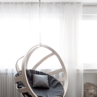 Separate Aufmerksamkeit verdienen tragbare Stuhlschaukeln, die an einem speziellen Rahmen befestigt sind und sich je nach den Bedürfnissen der Besitzer im Raum bewegen können.