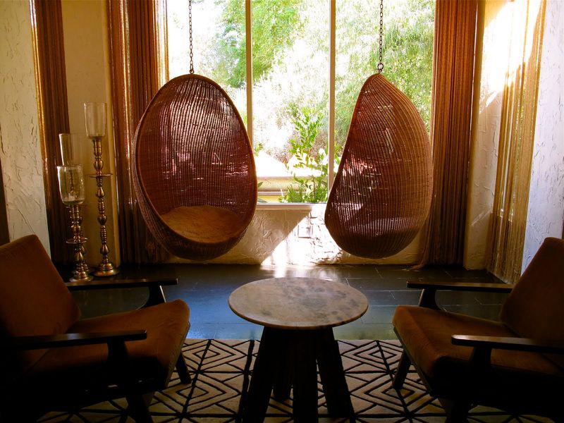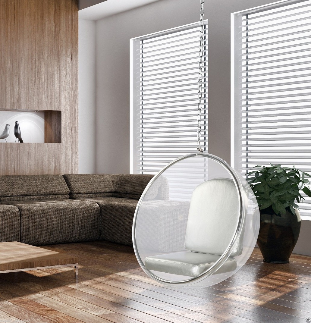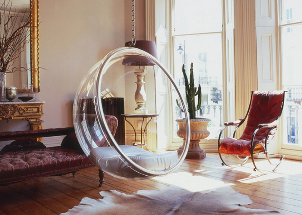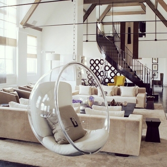 So schlug Nanna Ditzel 1957 ein innovatives Design eines eiförmigen Hängesessels namens "Egg" vor. Suspended Egg Stuhl gewann sofort Popularität unter Bohemians. Im Jahr 1968 entwickelte der finnische Designer Eero Aarniov dieses Konzept, indem er einen futuristischen transparenten hängenden kugelförmigen Anhänger schuf. Sein Design spiegelt die neueste Stimmung in der Architektur wider und erlaubt es, den Stil des Minimalismus auf ein neues Level zu heben.