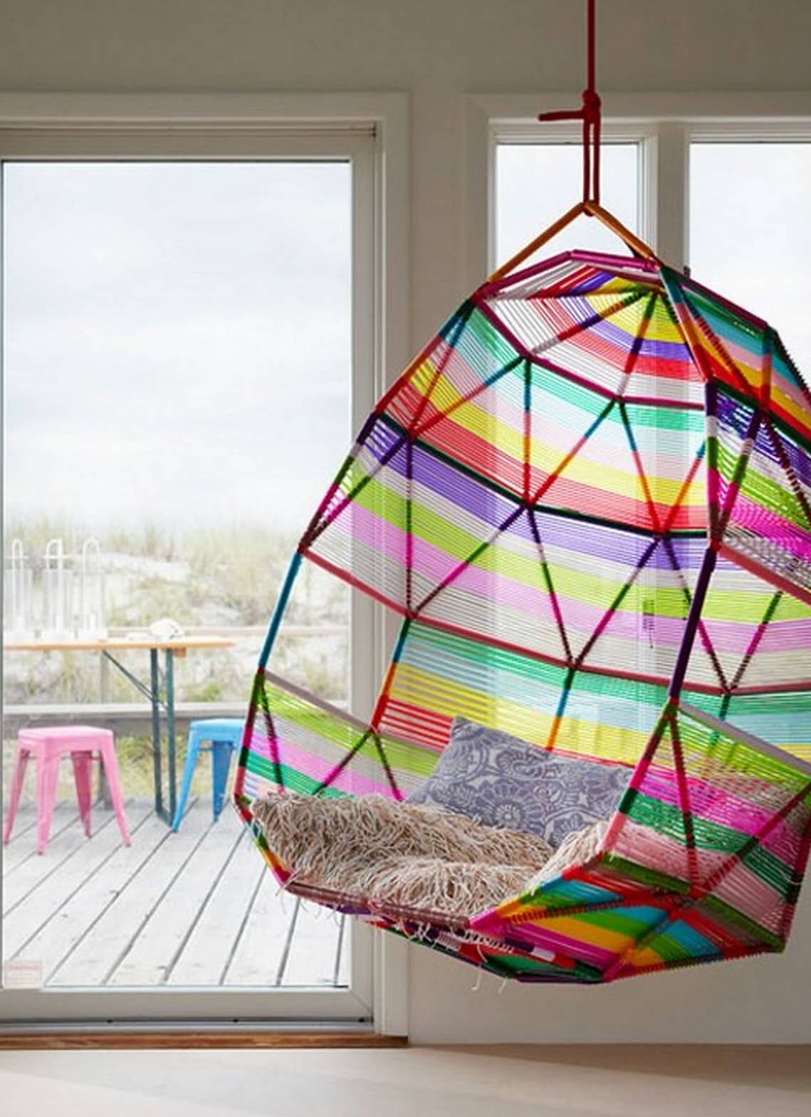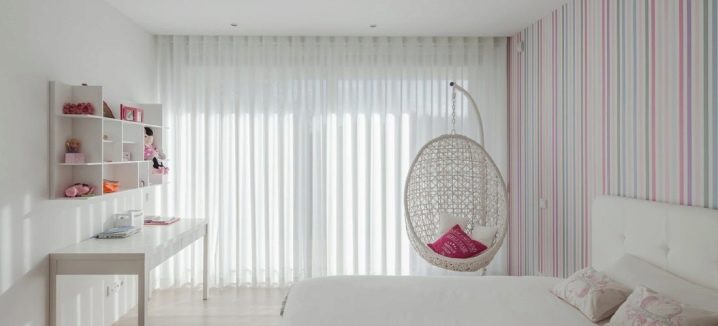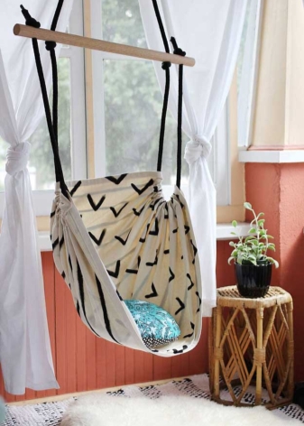 Oft gibt es Hängestühle, Hängematten aus Textilien. Sie werden hauptsächlich im Kinderdesign verwendet, da der Stoff für die Gestaltung eines so empfindlichen Raums besser geeignet ist.