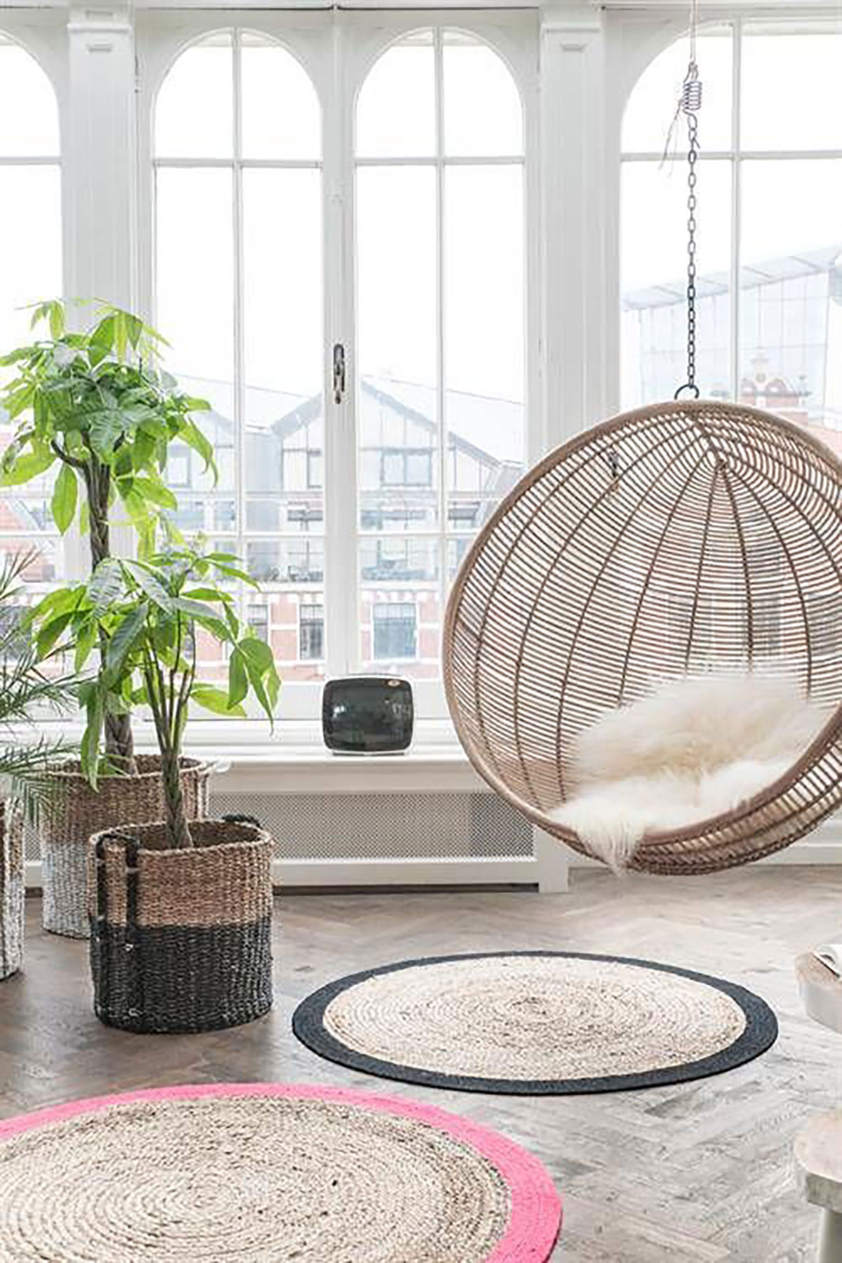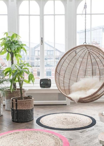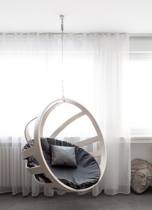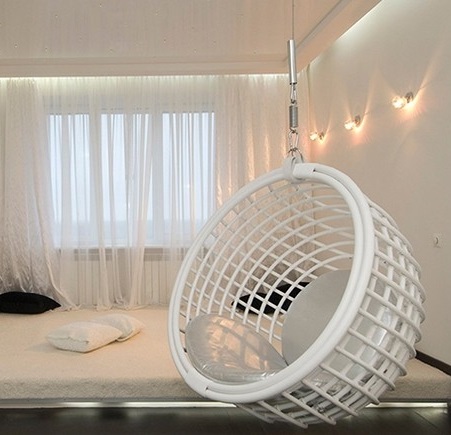- Achten Sie bei der Auswahl eines Schaukelstuhls auf die Gesamtgestaltung des Raumes. Suspended Stuhl kann für jedes Interieur gewählt werden,aber es sieht in minimalistischen Zimmern am eindrucksvollsten aus. Für die Registrierung werden je nach Gesamtkonzept sowohl eine gewebte als auch eine Kunststoffversion geeignet sein. Zum Beispiel, wenn das Interior Design auf Öko-Materialien beruhen würde, wäre die Wahl von Korbstühlen eine ausgezeichnete Lösung. Mit einem Schwerpunkt auf glatten Oberflächen und klaren Linien betont ein Schaukelstuhl in Form eines perfekt glatten Balls die Einzigartigkeit des Designs wie nichts anderes.