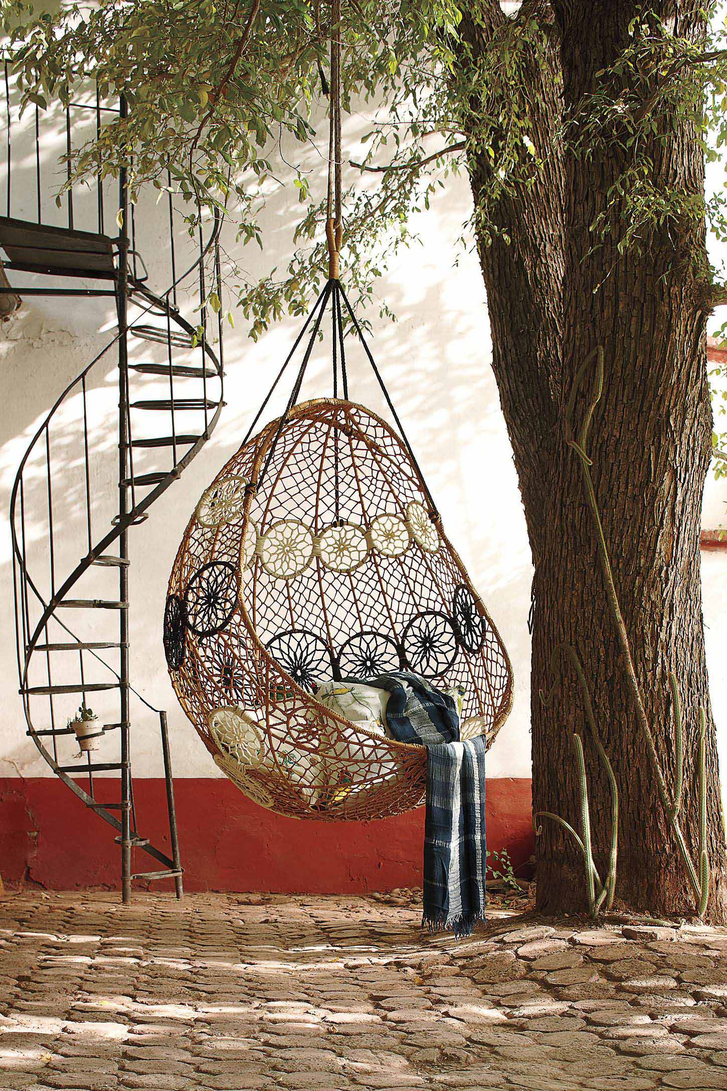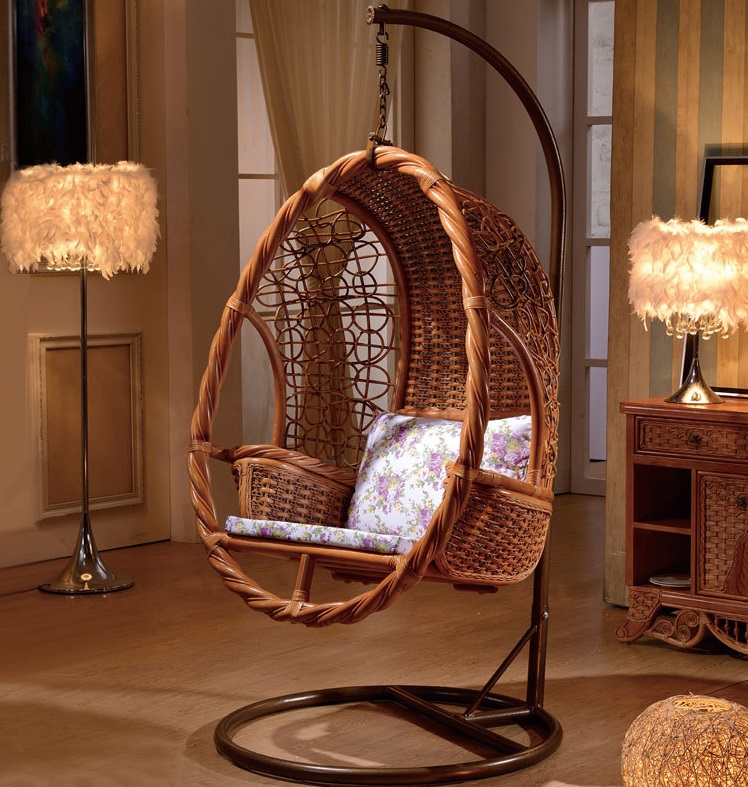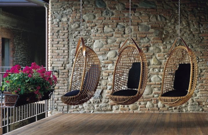 - Cottage, Gartenlaube, Terrasse. Um die üblichen Korbmöbel zu ersetzen, können Möbel suspendiert werden. Dies ist eine sehr interessante Möglichkeit, das Äußere eines Landhauses zu variieren. Es ist wichtig, den Schaukelstuhl rechtzeitig vor Feuchtigkeit zu schützen (z. B. ins Haus zu bringen), also wählen Sie mobile Modelle mit Bewegungsfähigkeit.