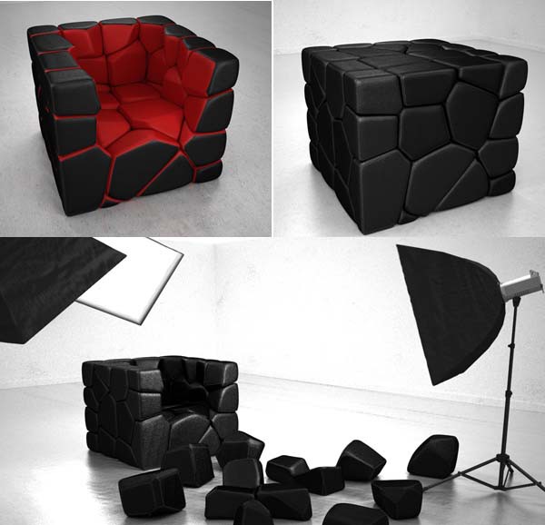 Die Umwandlung solcher Produkte erfolgt aufgrund des einzigartigen Füllstoffs, der die Form verändern kann. Der Stuhl wiederholt die Biegungen des menschlichen Körpers, bietet eine bequeme Position und gibt maximale Entspannung.