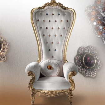 Das Hauptmerkmal des Stuhl-Thrones ist das Vorhandensein eines unglaublich luxuriösen Designs. Im Vergleich zu den Standardversionen werden diese Produkte im Innenraum als dekorative Bauteile verwendet. Das Design dieser Sitze ist ziemlich kompliziert, denn im Kern gibt es viele Details, die von Hand erstellt werden. Meistens handelt es sich um die Elemente des Threads.