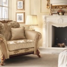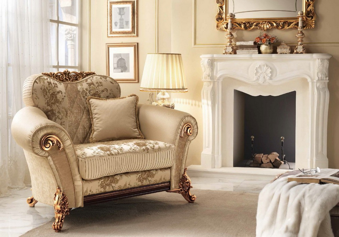 Sessel für das Wohnzimmer im Empire-Stil können massiv und leicht voluminös sein, mit luxuriösen Formen und Kurven. Natürlich können sie viel Platz einnehmen, daher sollte der Raumbereich angemessen sein. Aber auch ein Stuhl ergänzt die gemütliche Leseecke perfekt.