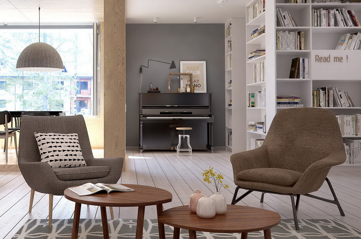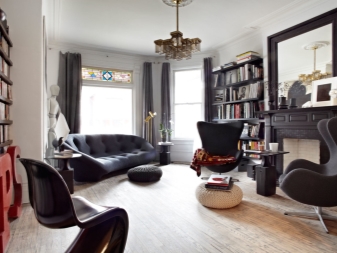- Nicht weniger interessant und Möbel im skandinavischen Stilwelche Basis wird meistens durch weiße Farbe oder verschiedene kalte Farbtöne der Farbskala hergestellt. Wenn Sie Stühle wählen, die einen solchen Stil im Interieur ergänzen, sollten Sie darauf achten, dass solche Möbel den Raum nicht zu sehr "einschränken". Es muss frei bleiben. Achten Sie darauf, die hölzernen oder transparenten Stühle zu überprüfen, die eine ausgezeichnete Lösung für das skandinavische Wohnzimmer sind.