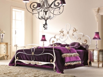 - Barocke Merkmale - die Größe der Formen, die ovale Form der Möbel, die komplexen Umrisse der Elemente. Ein schmiedeeisernes Bett mit einer durchbrochenen Rückenlehne und ein weiches Kopfteil, das mit der Wagen-Estrich-Technik hergestellt werden kann, passen perfekt in eine solche Situation.