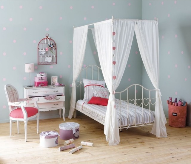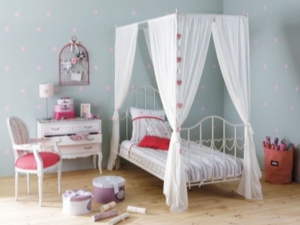 - Das folgende Modell wurde erstellt mit Rahmen für Baldachin. Weißer Rahmen und leichtes Gewebe schaffen eine sanfte und romantische Atmosphäre. Dieses Bett ist perfekt für das Zimmer eines jungen Mädchens.