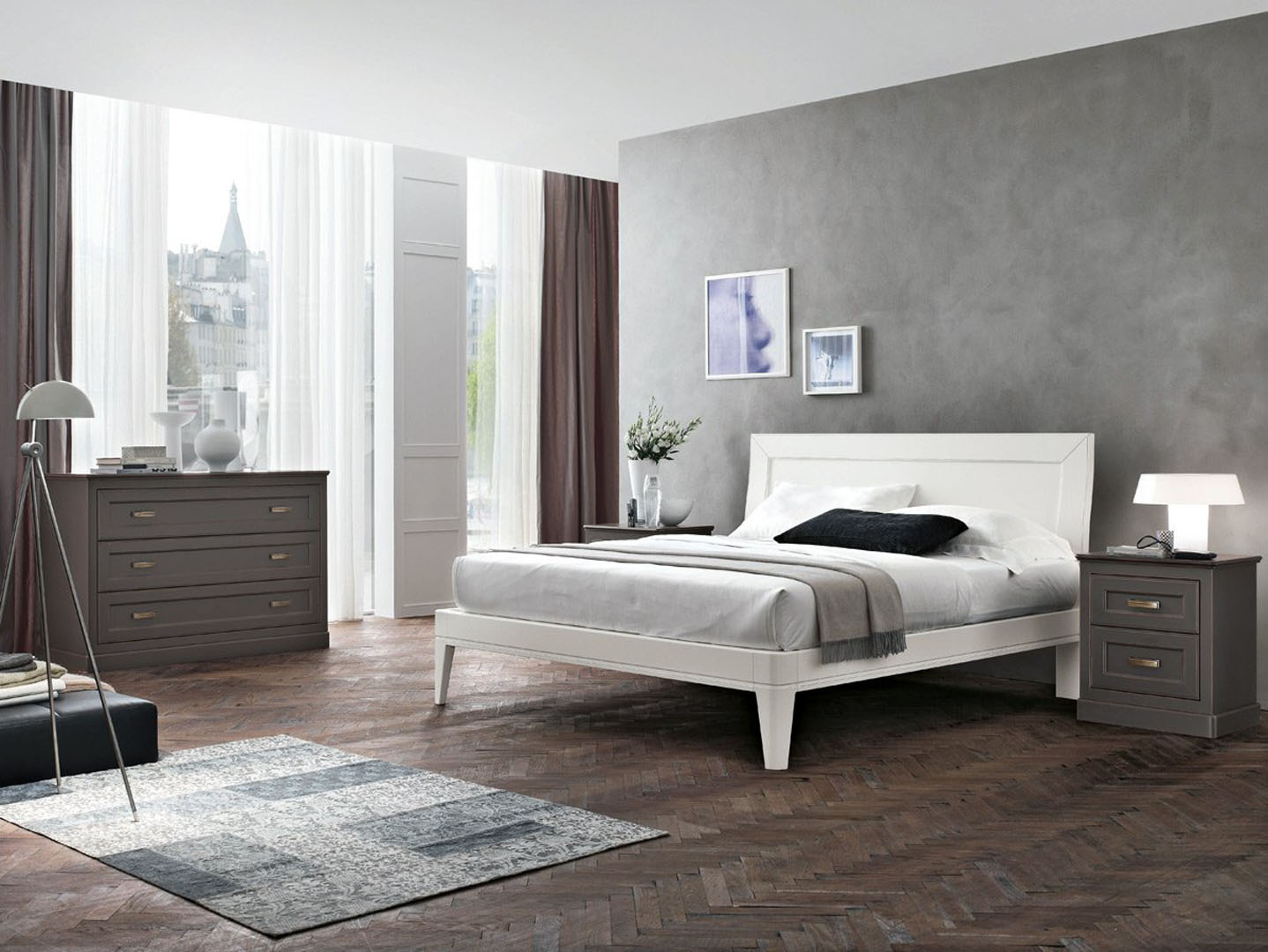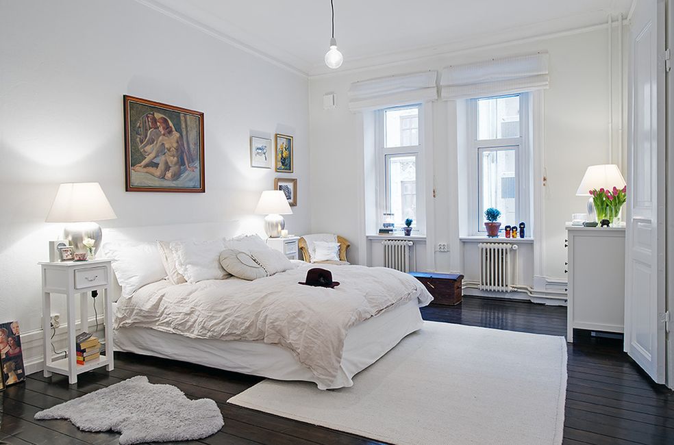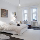 Es sieht sehr gut aus, dunkle Möbel, wie ein Nachttisch, Tisch oder Schrank vor einem weißen Bett. Dieser Kontrast sieht sehr stilvoll aus, Sie können auch ein solches Schlafzimmer mit einem leichten Bettvorleger hinzufügen.