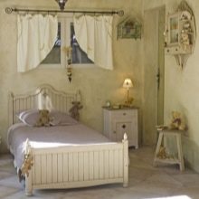 Weißes Bett in der Art Provence es wird sehr sanft und süß aussehen, du kannst es sogar in den Kindergarten legen. Normalerweise ist es ein Modell mit einem durchbrochenen Kopfteil, die aus weiß lackiertem Metall gefertigt sind. Die Beschichtung kann künstlich gealtert werden, um solchen Möbeln Charme zu verleihen.