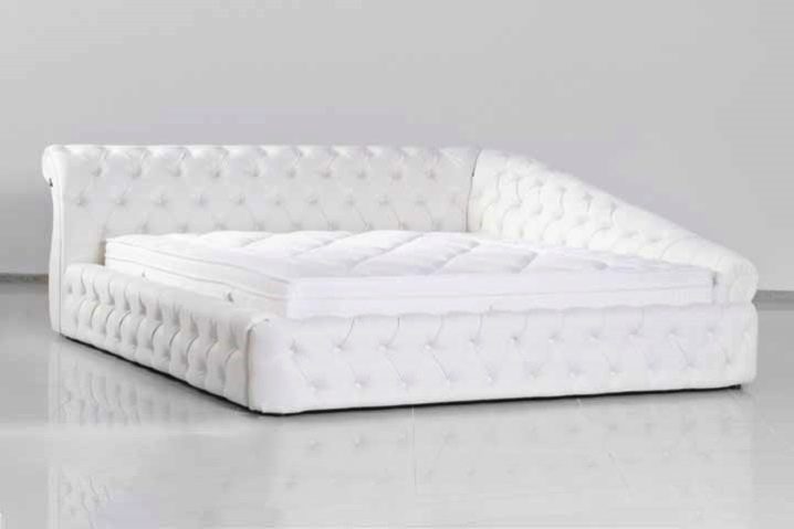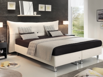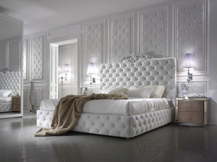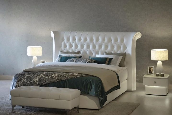 Sehr modisch ist jetzt das Dekor mit einer vierseitigen Krawatte. Er geht davon aus, dass der Kopf des Bettes mit Leder überdreht ist und mit Knöpfen oder Knöpfen gestaffelt durchbrochen ist und ein Muster in Form von Diamanten bildet. Dies ist eine sehr stilvolle und moderne Lösung, die perfekt in jedes Design passt. Normalerweise ist dieses Dekor mit weißen Lederbetten eingerichtet.