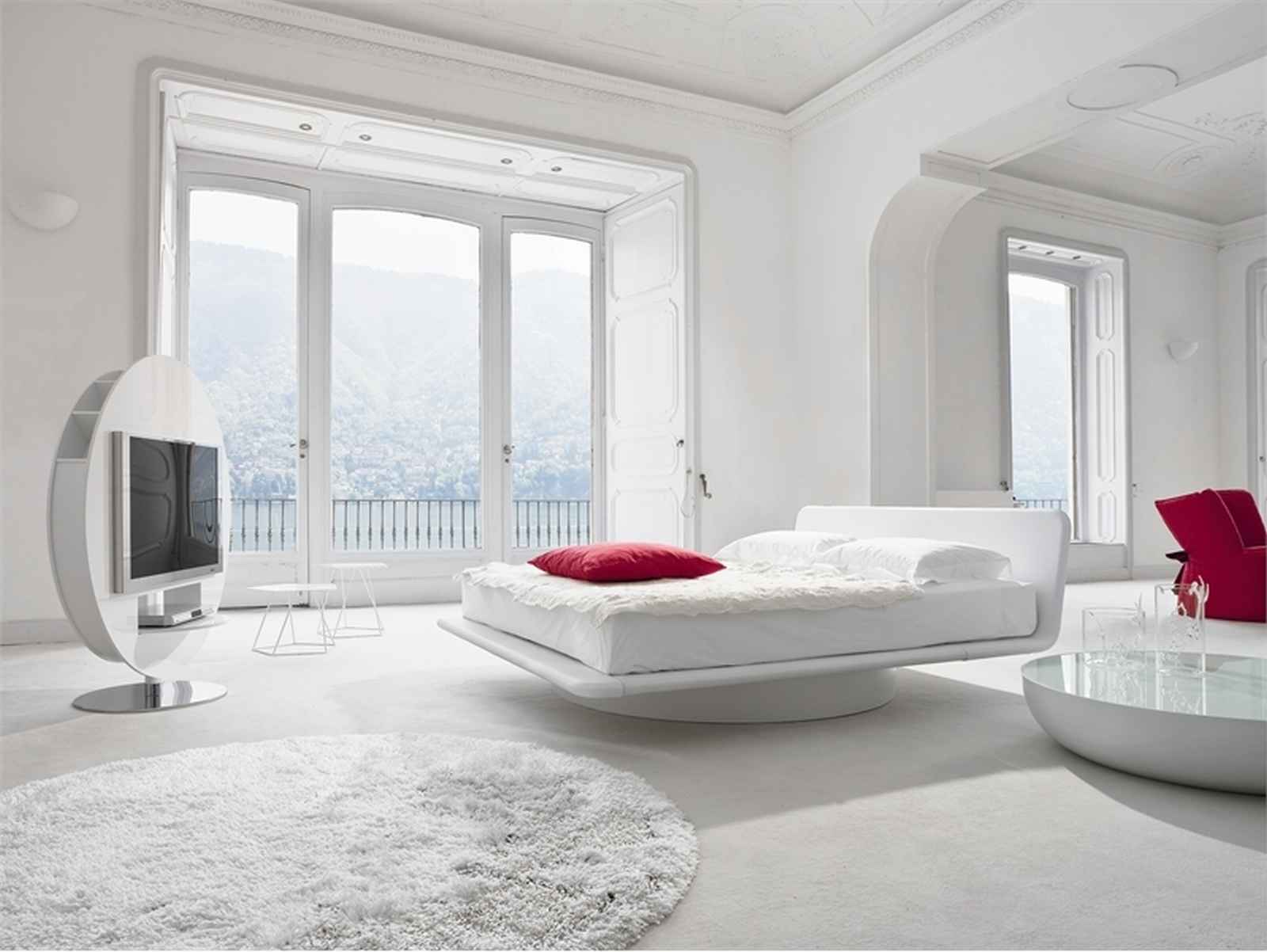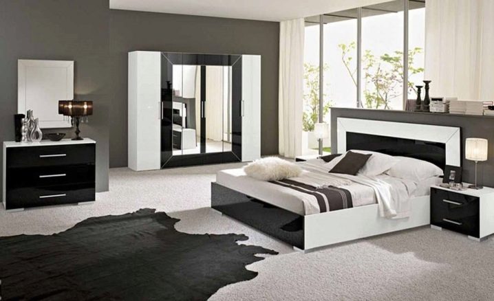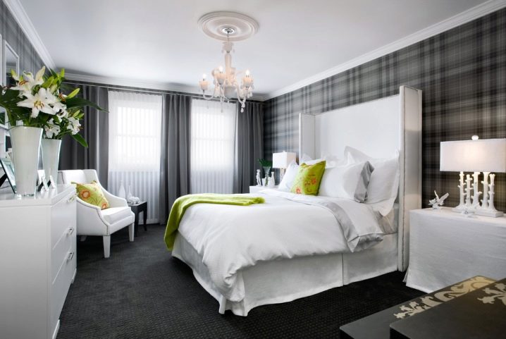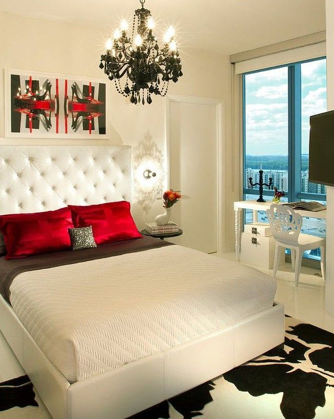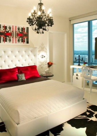 Es wird auch sehr interessant sein, schwarzes und weißes Modell zu sehen, die Hauptfarbe sollte hier weiß sein, und das Dekor kann in dunklen Farben gemacht werden. Dies ist eine sehr stilvolle und interessante Lösung. Das weiße Modell passt auch perfekt in das rote Schlafzimmer und fügt ihm helle Farben und Luxus hinzu. Diese Farbe wird Rot beruhigen und einen solchen Raum mit Raum füllen.
