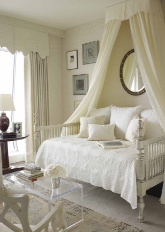- Es sieht sehr interessant in einer kleinen Schlafzimmerecke weiße Betten aus. Normalerweise sind dies Modelle, die nicht viel Platz einnehmen. Sie können das unterschiedlichste Design haben - vom Kind bis zum klassischen Erwachsenen.Für geräumigere Zimmer perfekte Schlafzimmermöbel mit einem Aufzug. Solch ein Modell im Raum wird einem königlichen Schlafzimmer ähneln, und wenn Sie es mit einem Baldachin schmücken, wird diese Option sehr luxuriös aussehen.