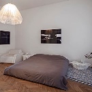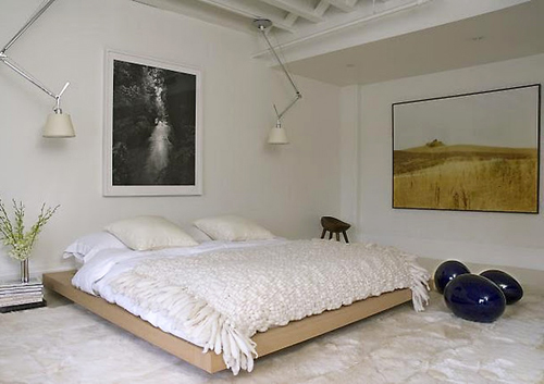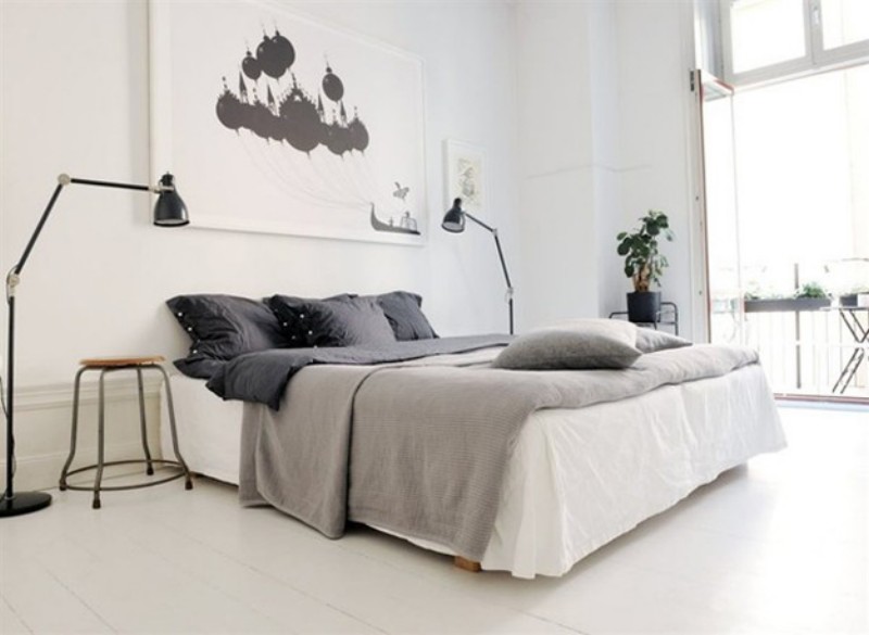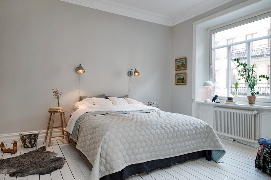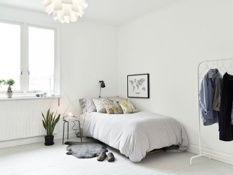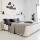 - Wandleuchter, Armaturen. Kunstlichtgeräte ergänzen das Interieur und schmücken den Raum über dem Bett und lenken die Aufmerksamkeit auf sich.Das Fehlen eines Kopfteils wird niemand bemerken.