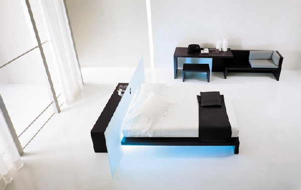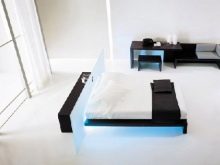 - Ultramodern und interessant Es wird schwarz glänzend Bett mit Licht, das über seine gesamte Oberfläche installiert ist aussehen.