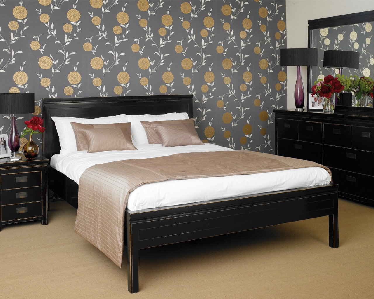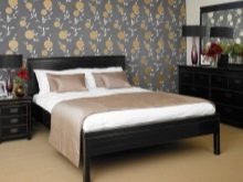 - Wenn Sie nicht nur ein schwarzes Bett, sondern auch andere Möbel einer bestimmten Farbe installieren möchten, dann sollte die Dekoration der Wände im Raum sicherlich leicht sein. Sehr schöne dunkle Möbel sind mit weichen blauen und hellvioletten Blumen kombiniert.