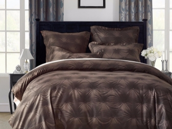 - Ein Bett aus dunklen Materialien Es wird perfekt mit leichter Wäsche aussehen, die sogar an die Farbe der Wandverkleidung angepasst werden kann.