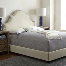Bett mit einem Kopfteil aus Stoff - nicht allzu häufig. Solche Materialien akzeptieren keine Nassreinigung, sie sind schwieriger von Verschmutzungen zu reinigen, und es besteht auch die Möglichkeit des Fressens bei häufiger Verwendung der Rückenlehne als Stütze für den Sitz.