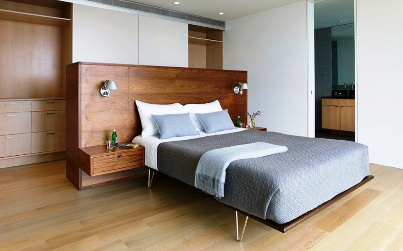 Kopfteil mit eingebauten Regalen - eine praktische und originelle Lösung. Wenn die Größe des Schlafzimmers klein ist, wird zusätzlicher Platz zum Speichern wichtiger Details sehr nützlich sein.